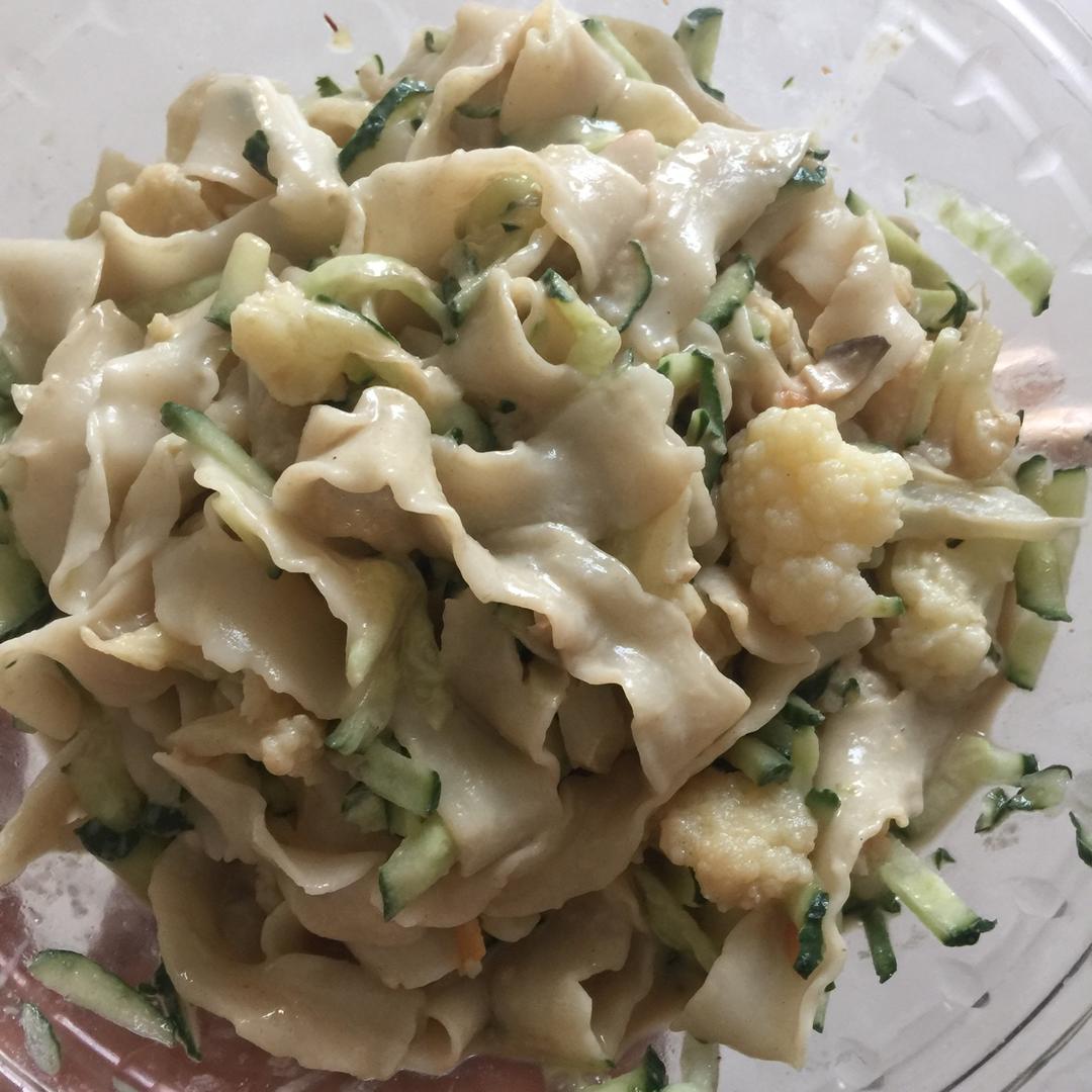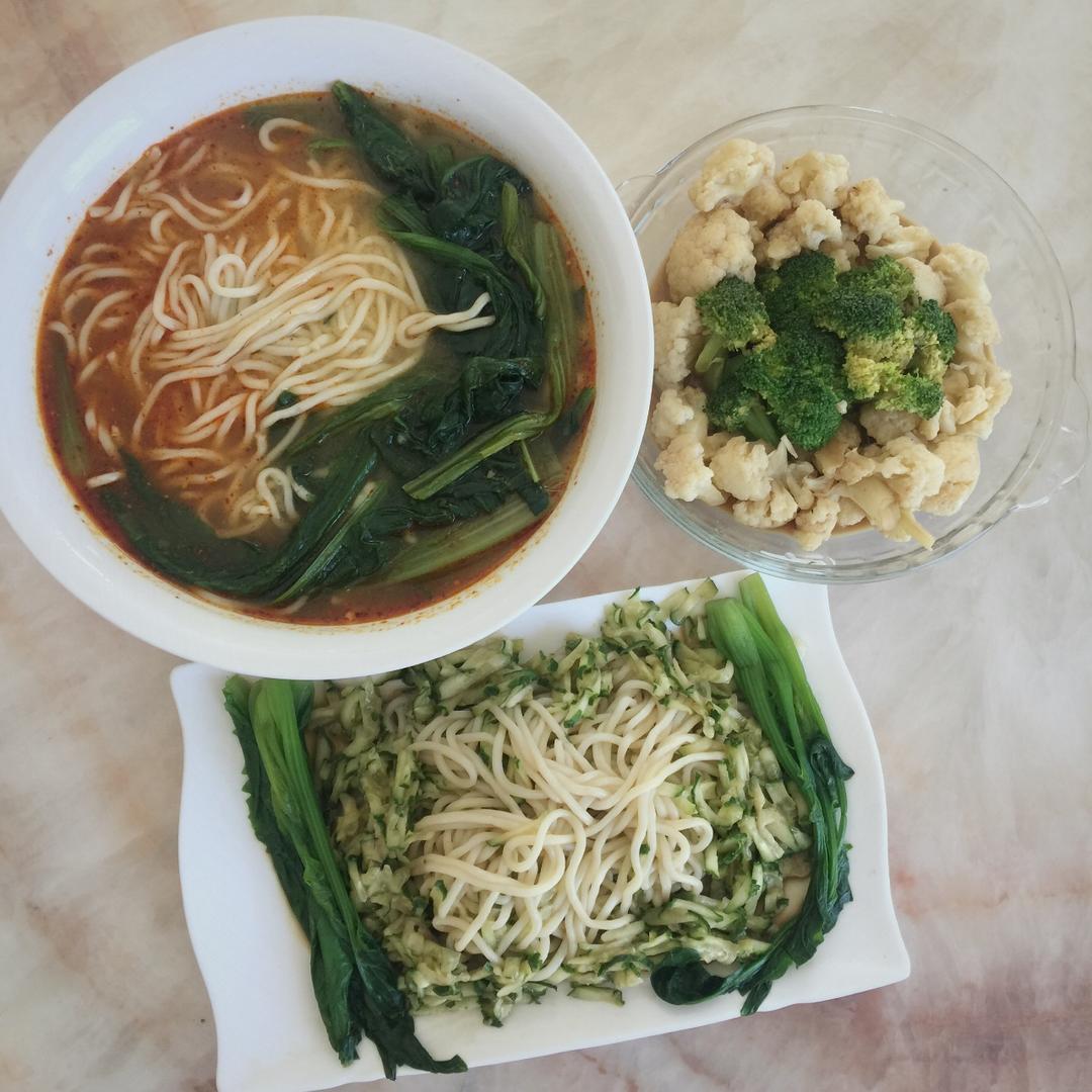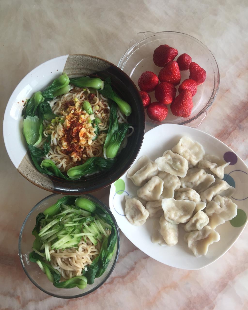 宝宝👶十点才醒,那早饭跟午饭一起吧:油泼面,黄瓜🥒油菜心麻酱小面,白菜大豆蛋白水饺,再一份🍓 #午餐•2018年2月27...