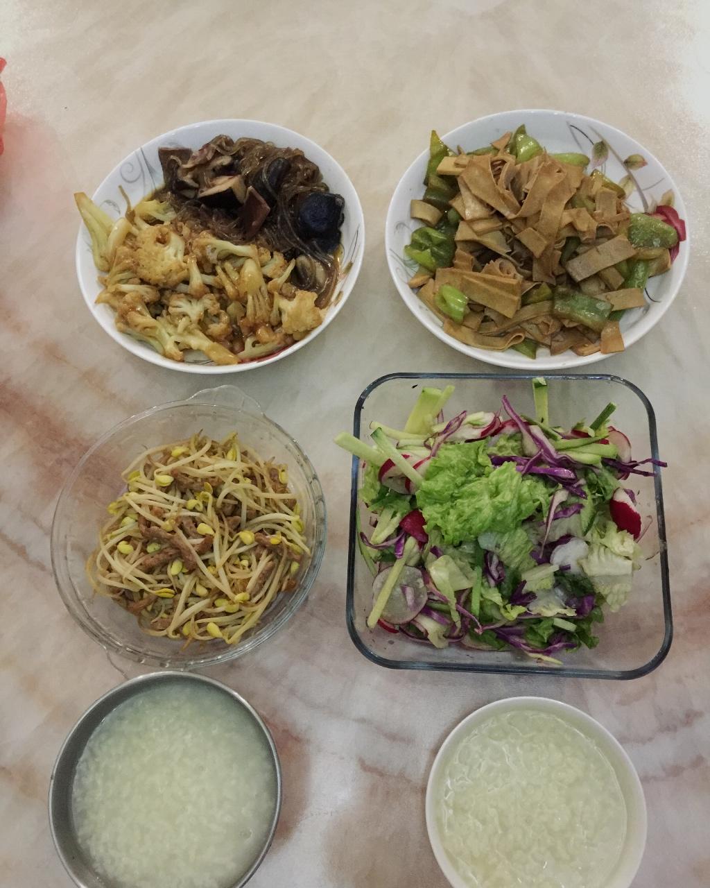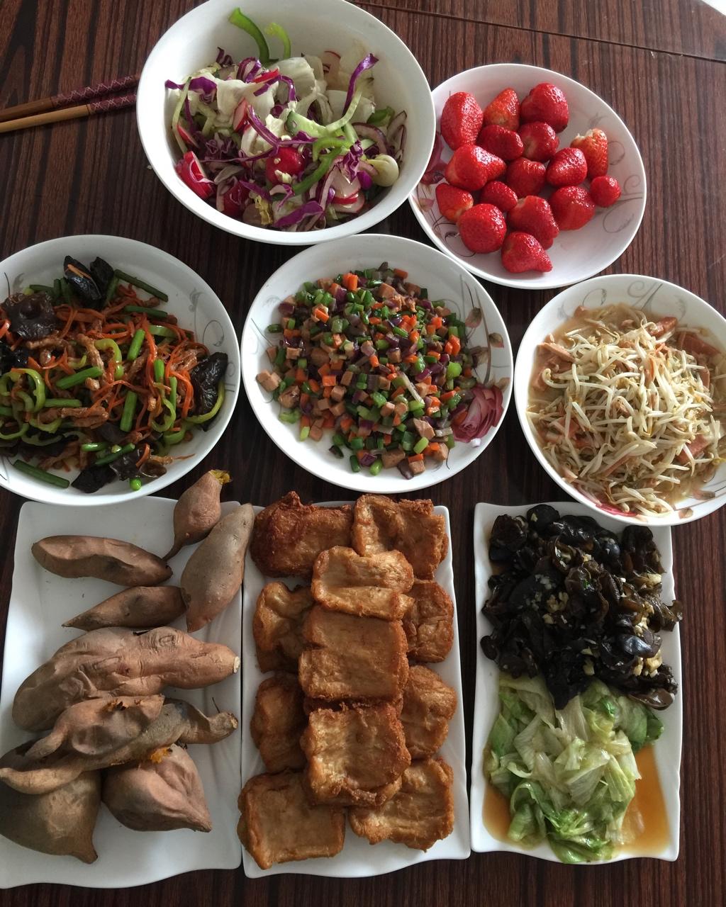 【初四继续吃草的素餐】:蔬菜沙拉🥗,🍓,素鱼香素肉丝,清炒时蔬丁,豆芽素火腿,烤红薯🍠,炸大豆蛋白,爆炒木耳,清炒球生菜...