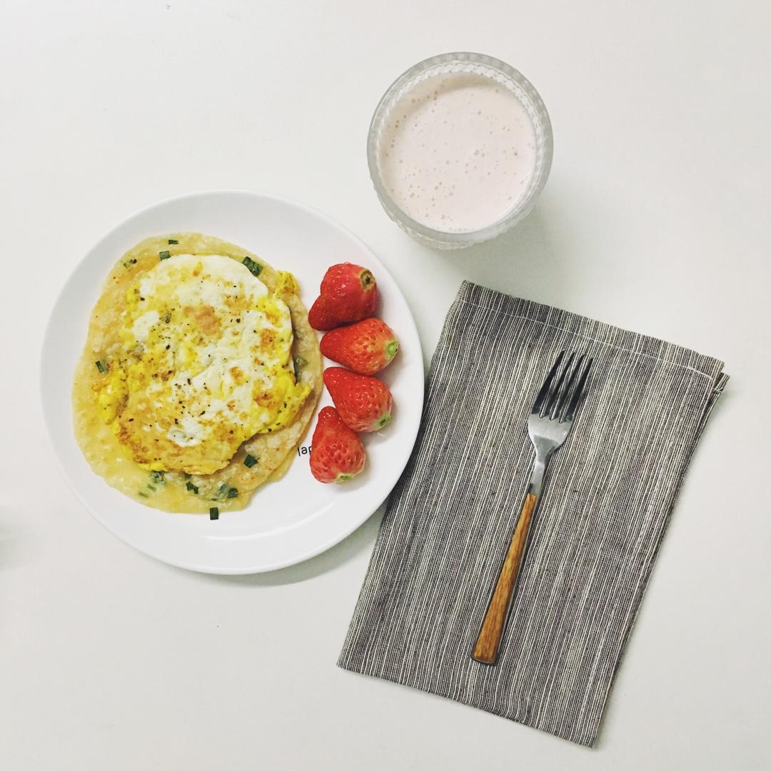 葱油饼+煎蛋+香蕉草莓奶昔