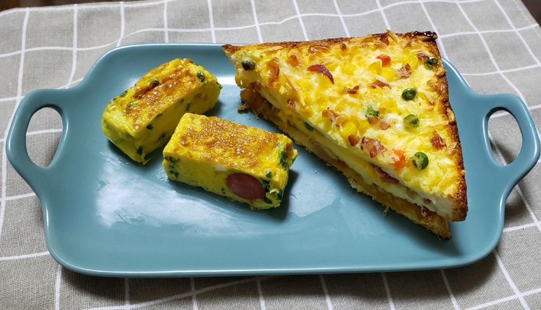 买的吐司够厚,用了三片,加了蔬菜粒,加了芝士片,烤化后味道棒极了。满满的工作日热量来源