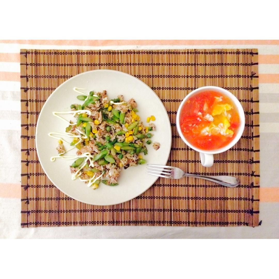 05132017 N.63/304 17分钟。芦笋金枪鱼炒饭(含豌豆玉米)+番茄蛋汤。盘子版面不平衡,蛋黄酱来救场~目测...