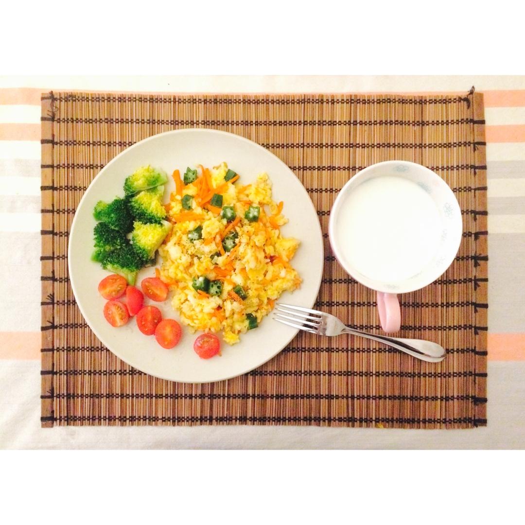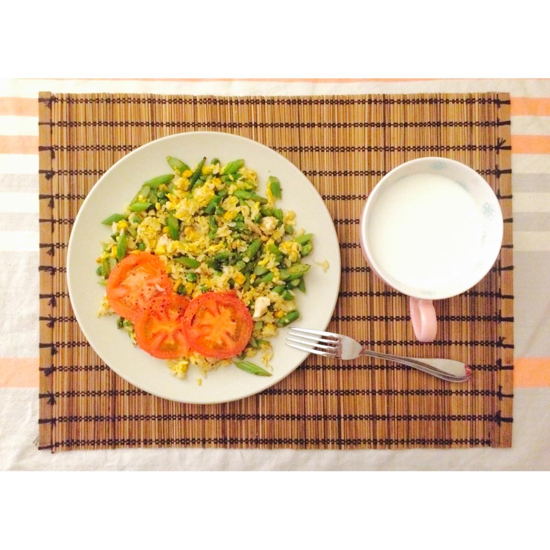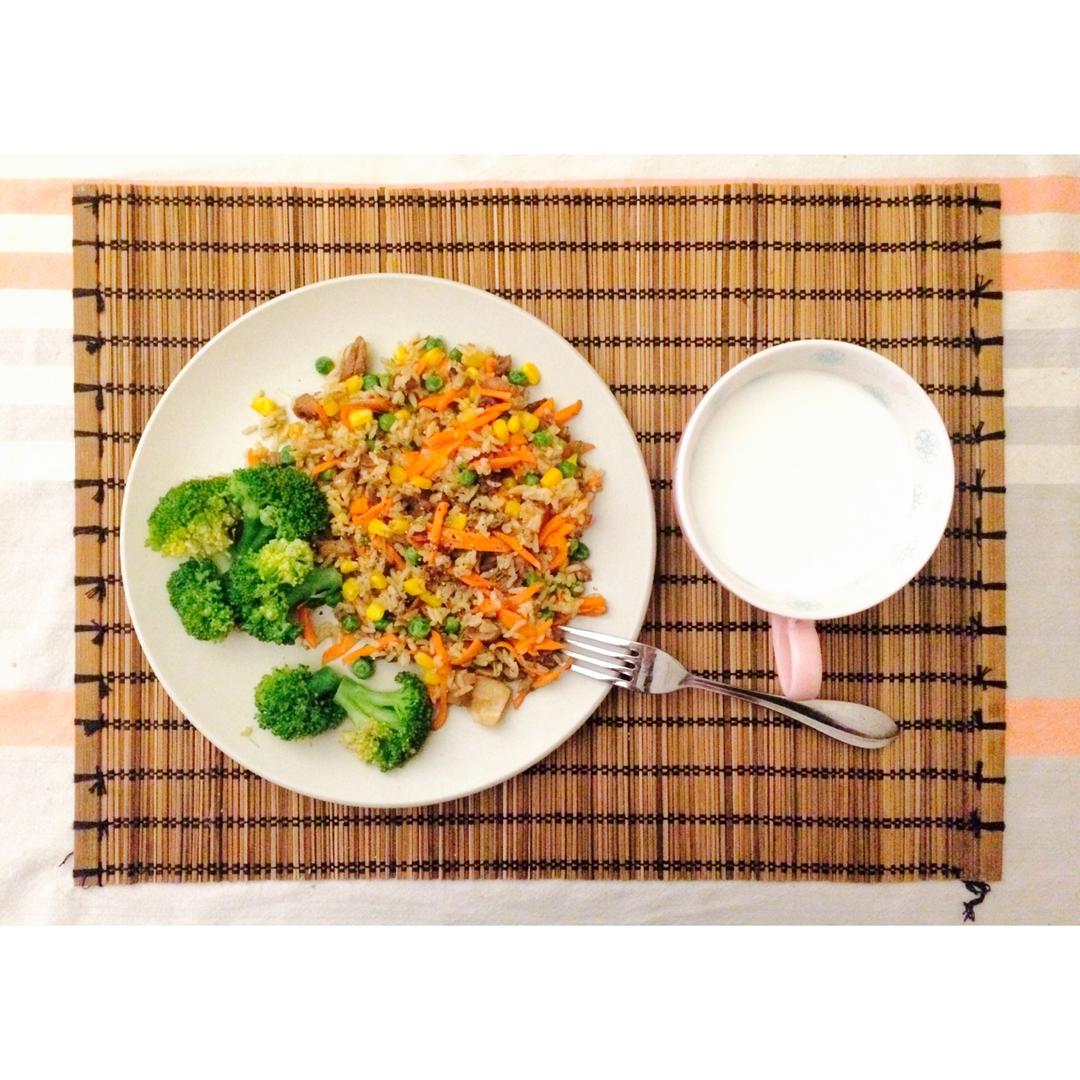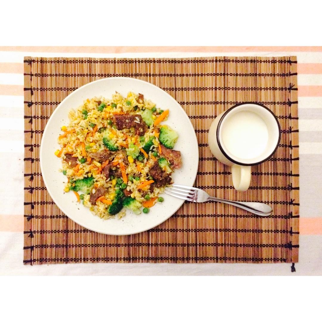 05082017 N.58/299 14分钟。什锦炒饭+牛奶。又又又没听见闹钟,只好把冰箱里的食材一股脑儿丢进锅里咯~😂...