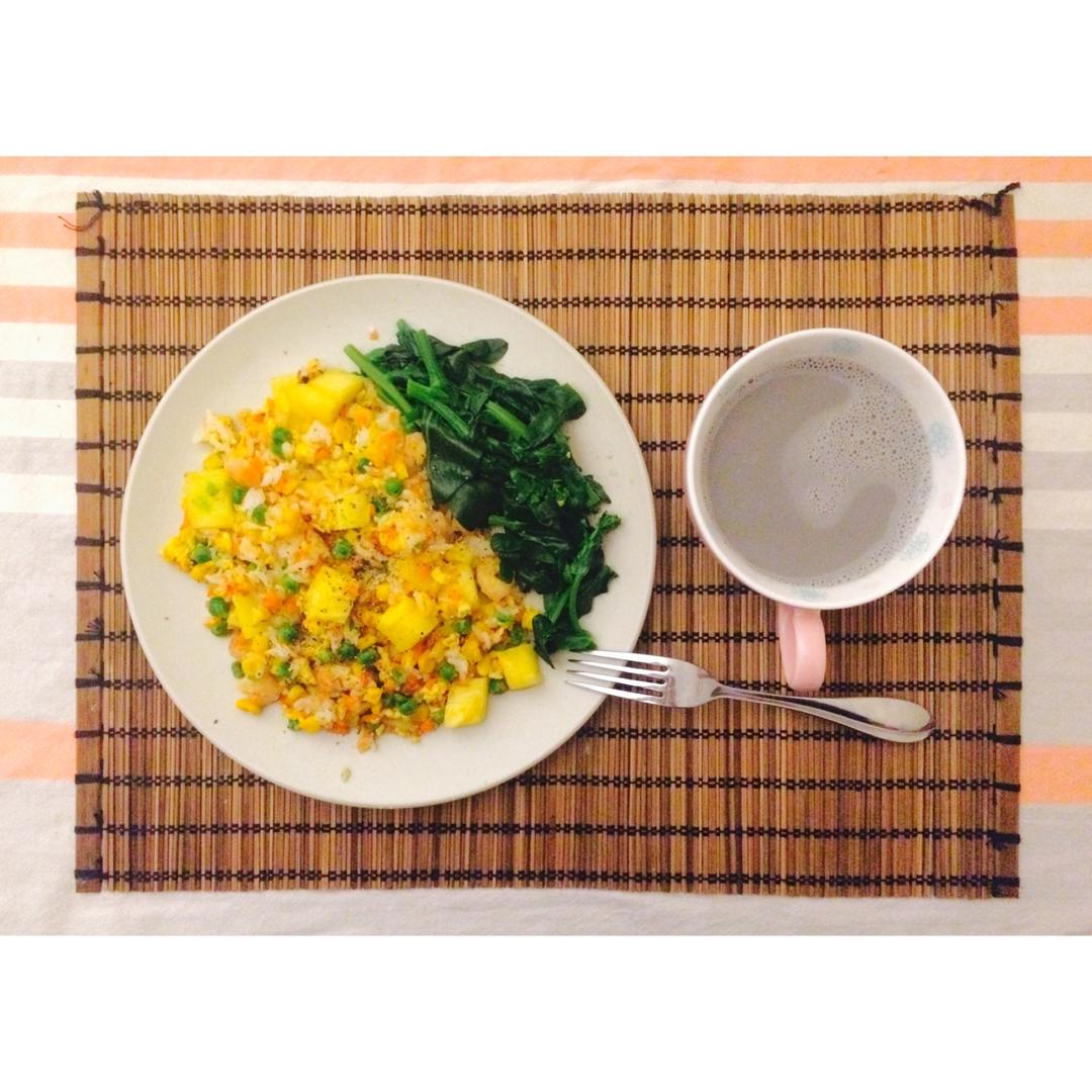 N.24/265 23分钟 菠萝炒饭(米饭虾仁豌豆玉米胡萝卜鸡蛋菠萝)+水煮青菜+花生芝麻黑豆浆 #早餐•2017年4月...