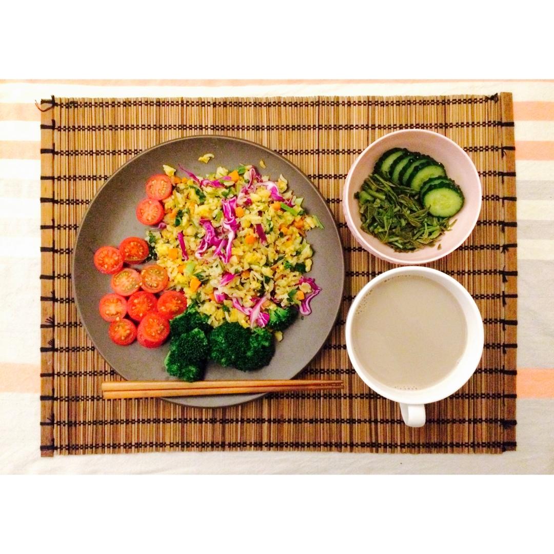 N.14/255 35分钟 右手拇指被划了个口子,做饭极不方便。杂蔬黄金炒饭+水煮西兰花+小番茄+黄瓜+凉拌香椿(一丢丢...
