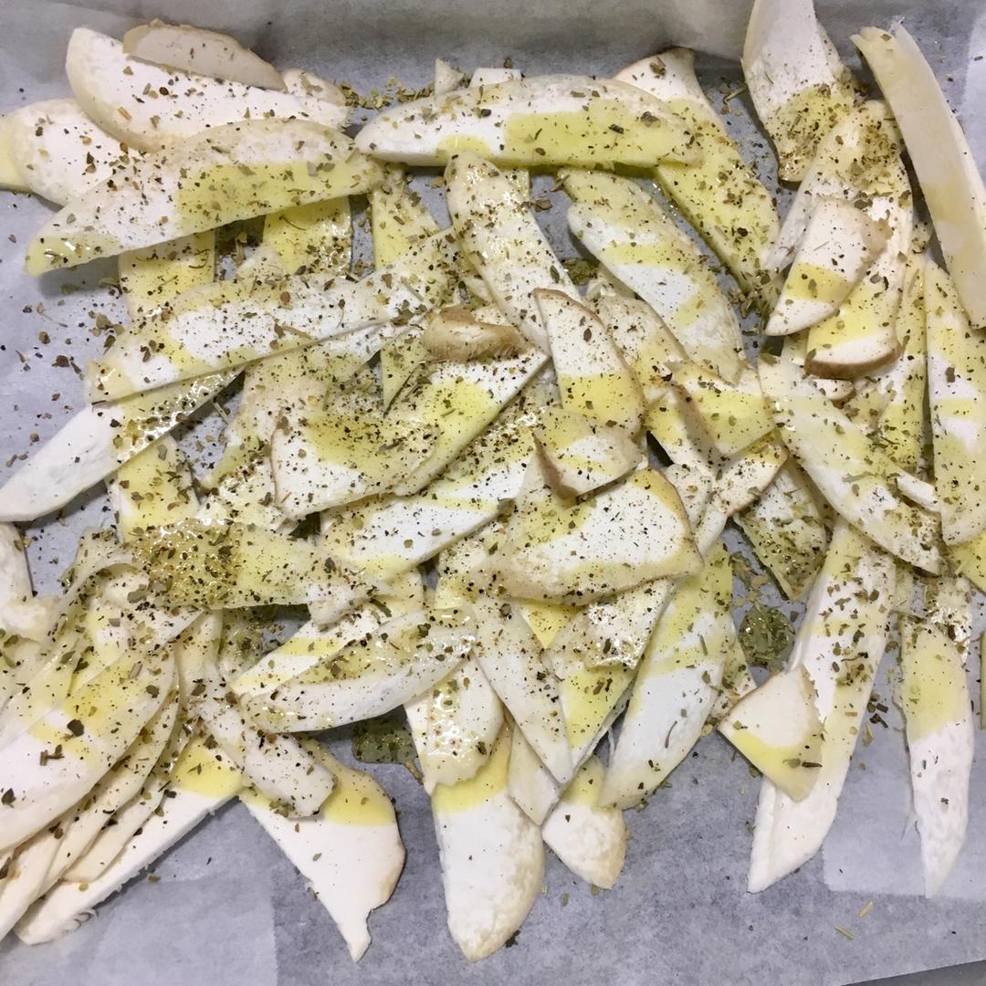 为了解决一根杏鲍菇 我随意加了香草碎 黑胡椒 盐 倒点橄榄油 扔进烤箱150度烤了30分钟 中途加了点蚝...
