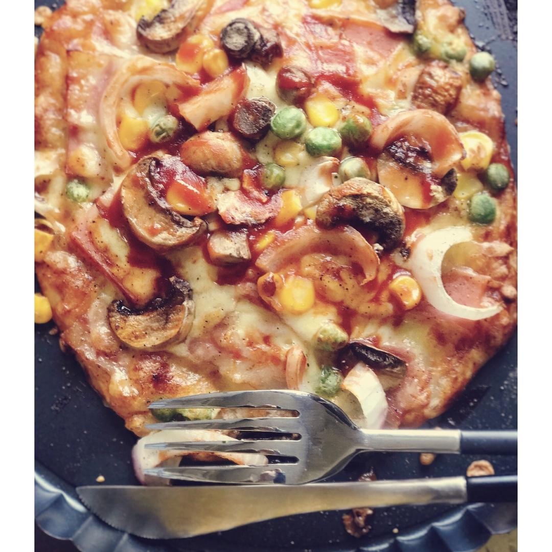 做了个薄低披萨,在做蛋糕所以厨房跟打架一样来不及凹造型了2333
