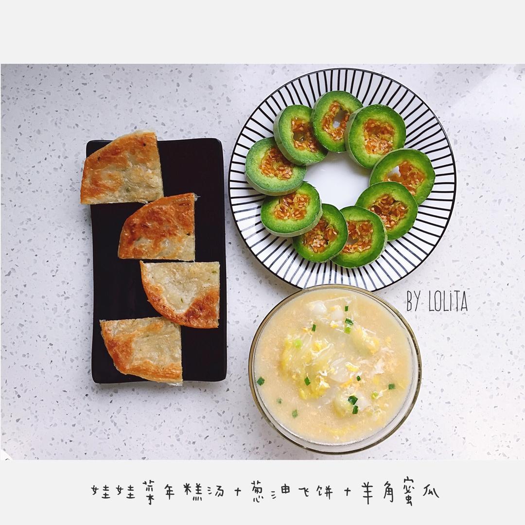 早餐:娃娃菜年糕汤+葱油飞饼+羊角蜜瓜