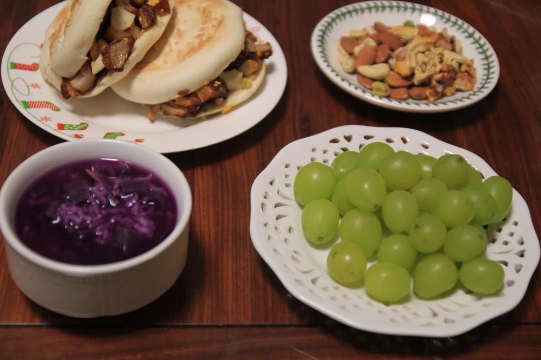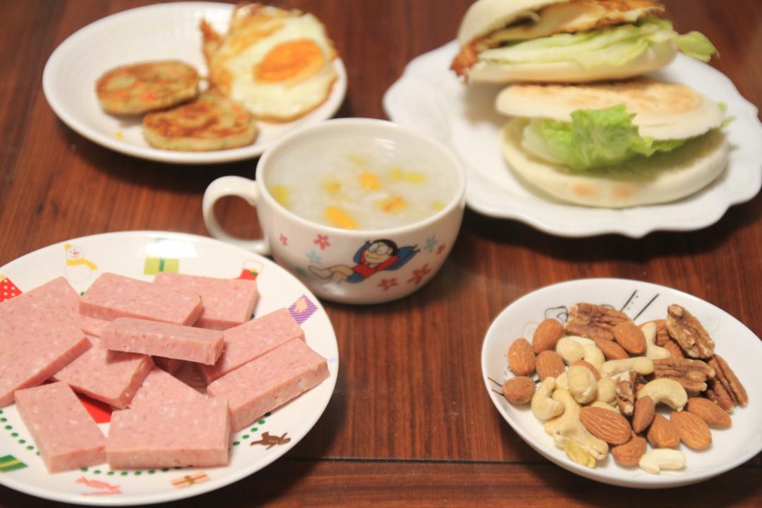 灿烂家早餐 中式汉堡+红薯粥+午餐肉+荷包蛋+鲜虾饼+坚果,小妞想喝的红...