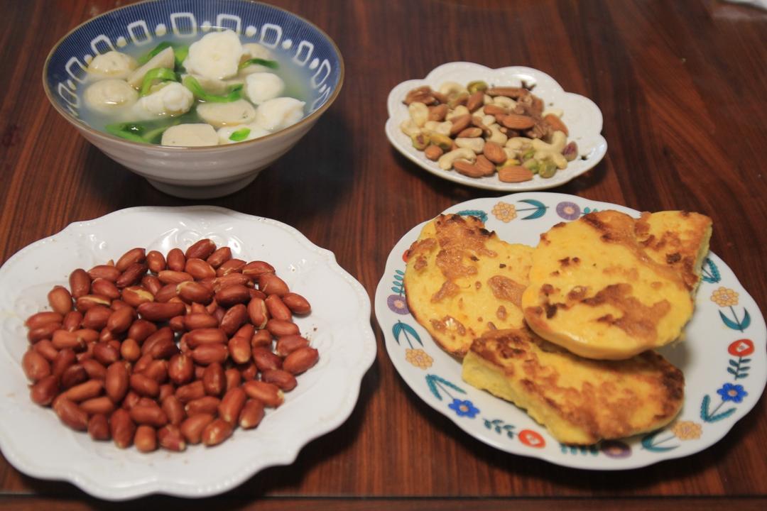 灿烂家早餐 蛋煎馒头片+鱼丸汤+烤花生米+坚果,小妞点餐喝鱼丸汤,确切...