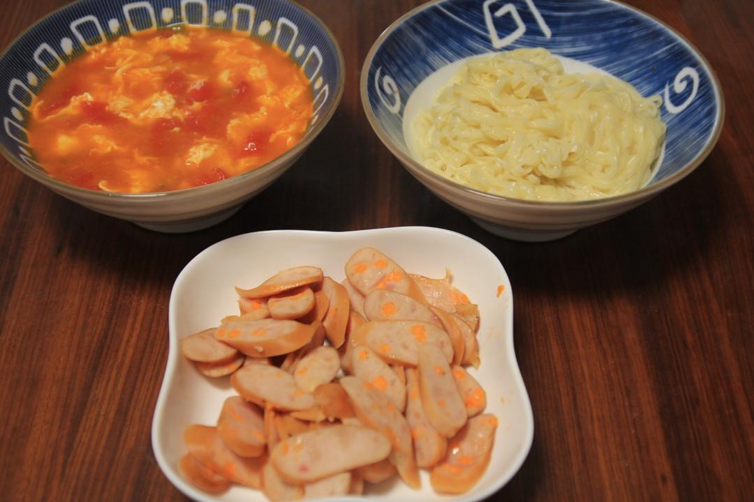 灿烂家早餐 面条+西红柿鸡蛋面+早餐肠,最最家常的西红柿鸡蛋面,超市买了...