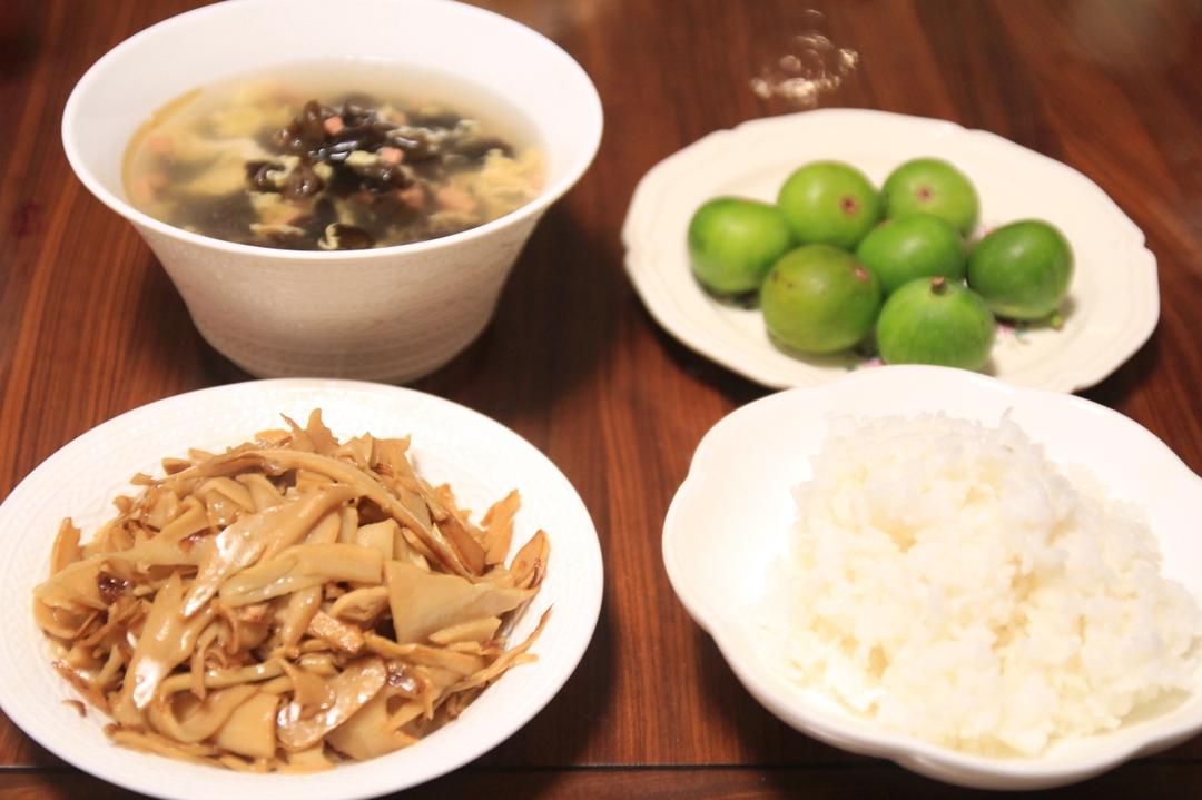 灿烂家早餐 米饭+木耳鸡蛋汤+葱油笋片+无花果,周末的懒觉感觉像一种奢...