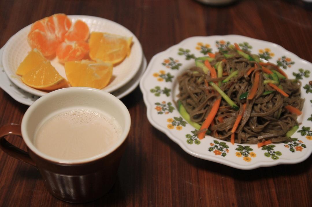 灿烂家早餐 时蔬炒面+花生核桃露+桔子+橙子,盆友给了当季的新核桃和花...