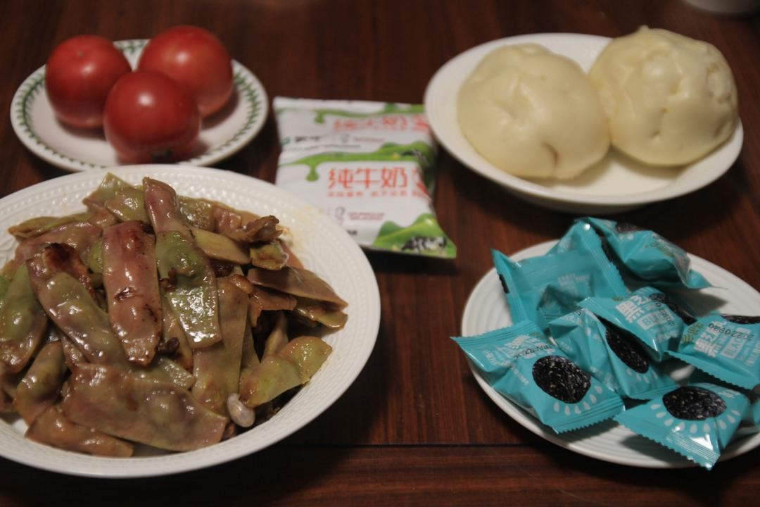 灿烂家早餐 黄米包+炒油豆+黑芝麻丸+草莓西红柿+牛奶,超市看到油豆买了...