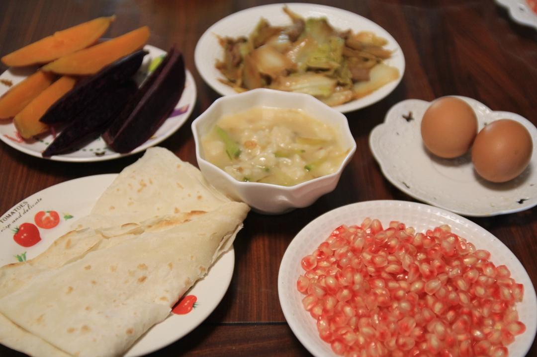 灿烂家早餐 单饼+鸡蛋+炒白菜+蒸红薯紫薯+萝卜丝疙瘩汤+石榴,昨日霜...