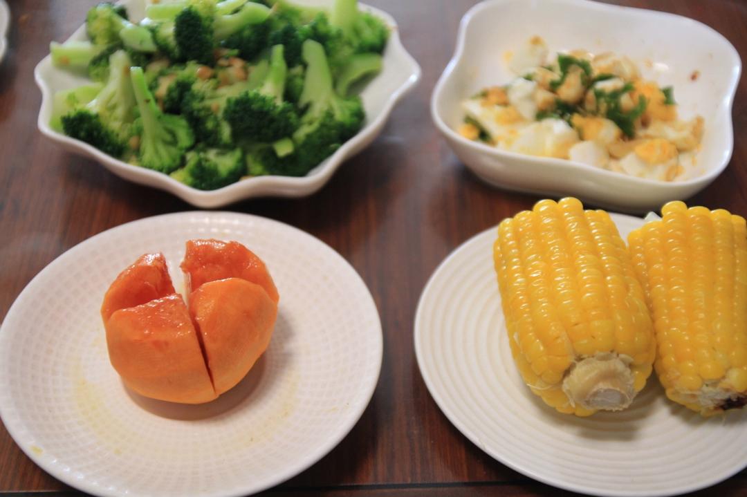 灿烂家早餐 玉米+蒜蓉西兰花+拌鸡蛋+柿子,早饭都要做好了,起床的小妞...