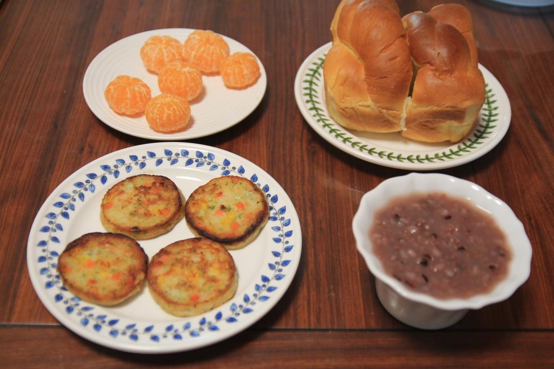 灿烂家早餐 老式面包+杂粮粥+时蔬鲜虾饼+小桔子,今日老面包是黄油版,有...