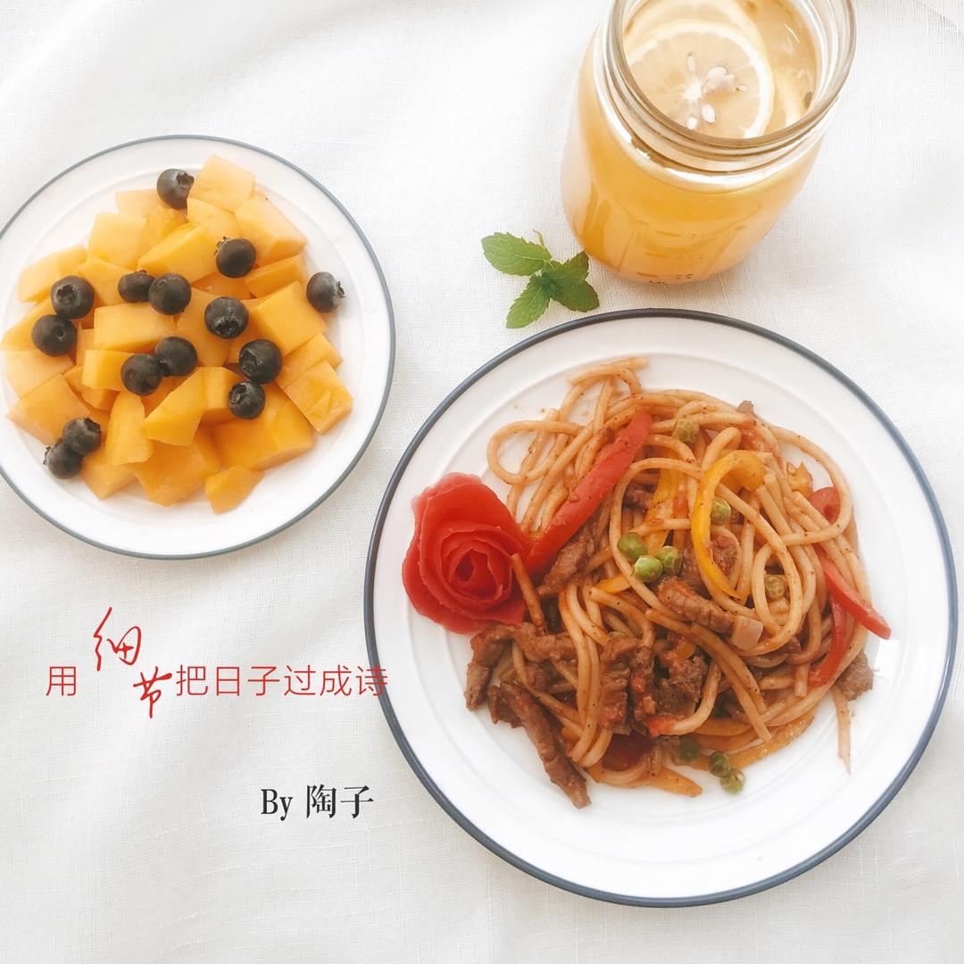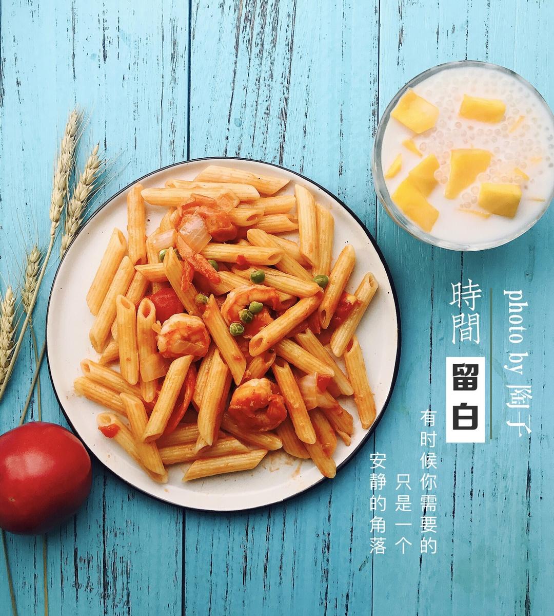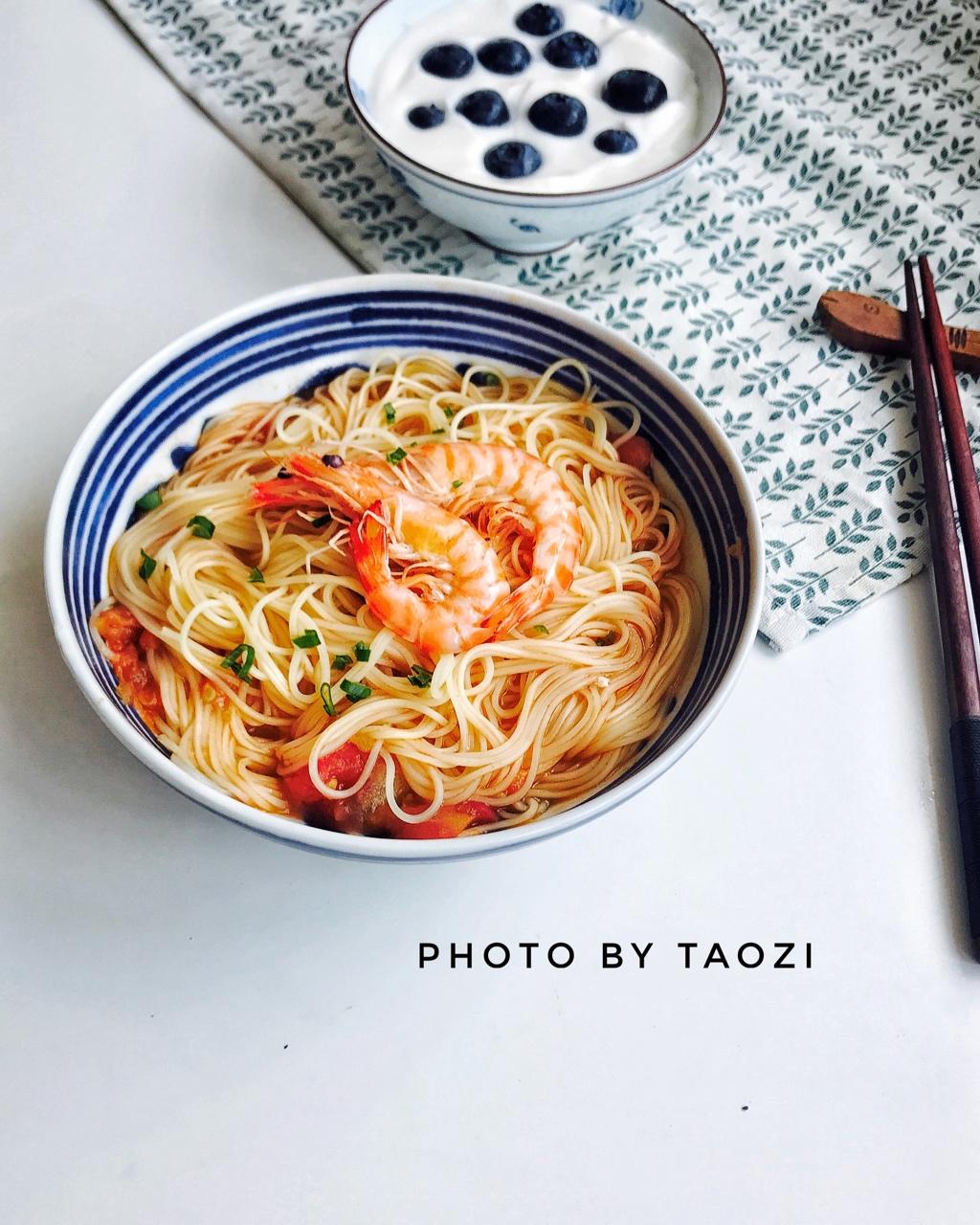 起晚了,做个简单的番茄竹升面,基围虾上市的季节,物美价廉,煮几只摆在面上,拉高面的颜值.安慕希希腊酸奶摆上蓝莓,早安,期...