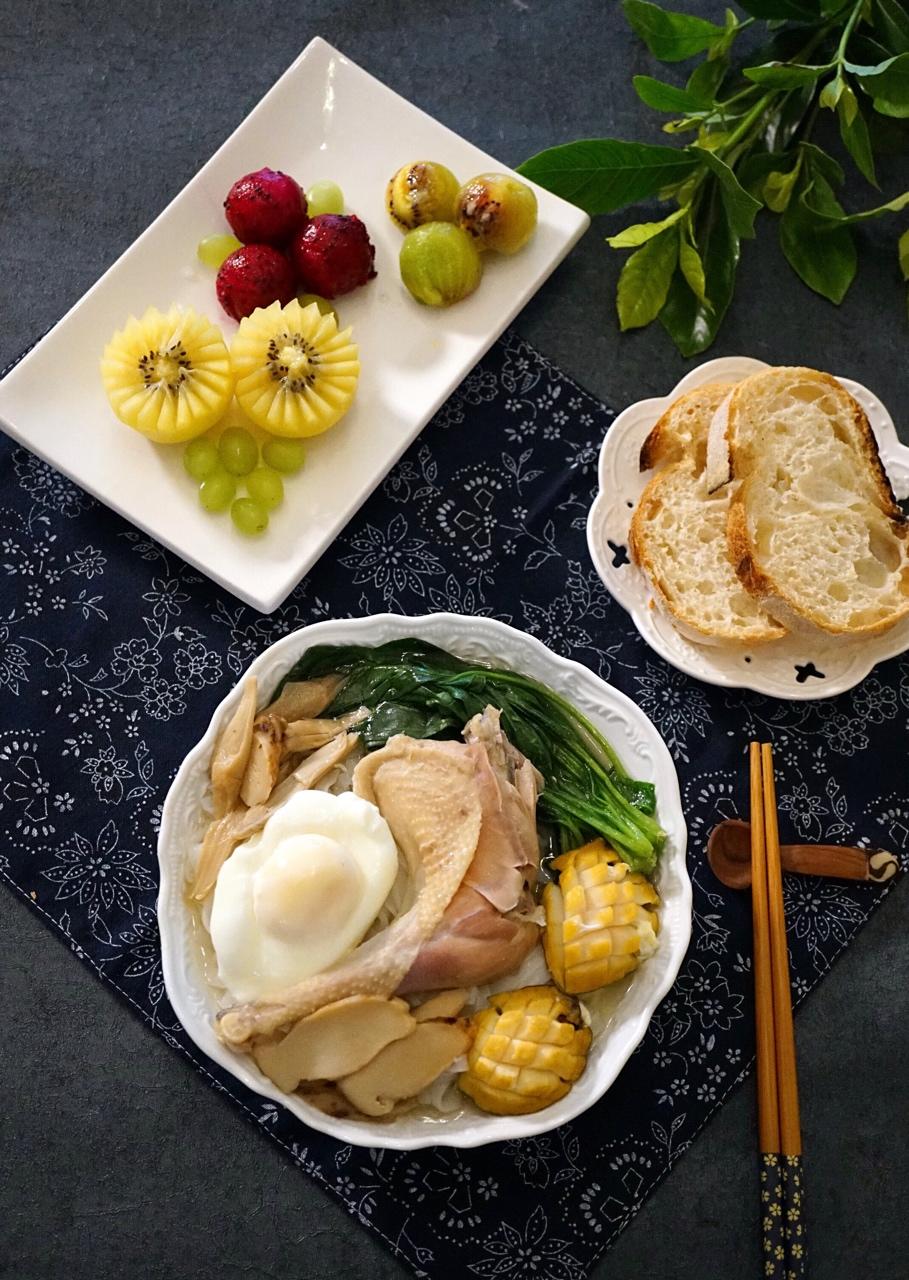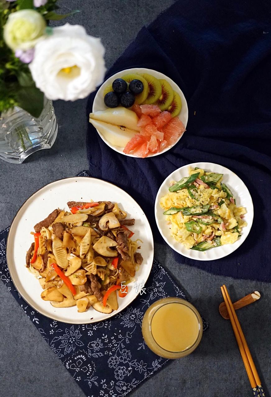 松茸土笋牛肉炒面,秋葵培根炒鸡蛋,果盘,加鲜榨葡萄雪梨果汁。