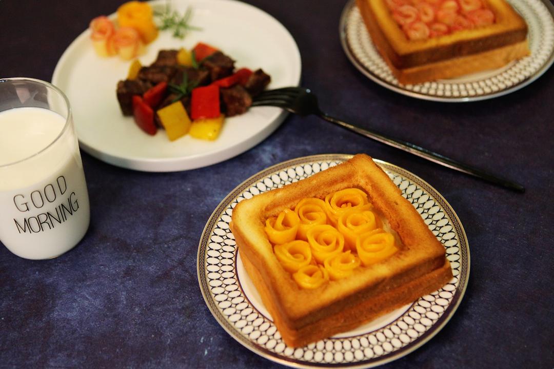 玫瑰花吐司,芒果,苹果两个版本,还可以做牛油果,三文鱼什么的,看你喜欢吧。...