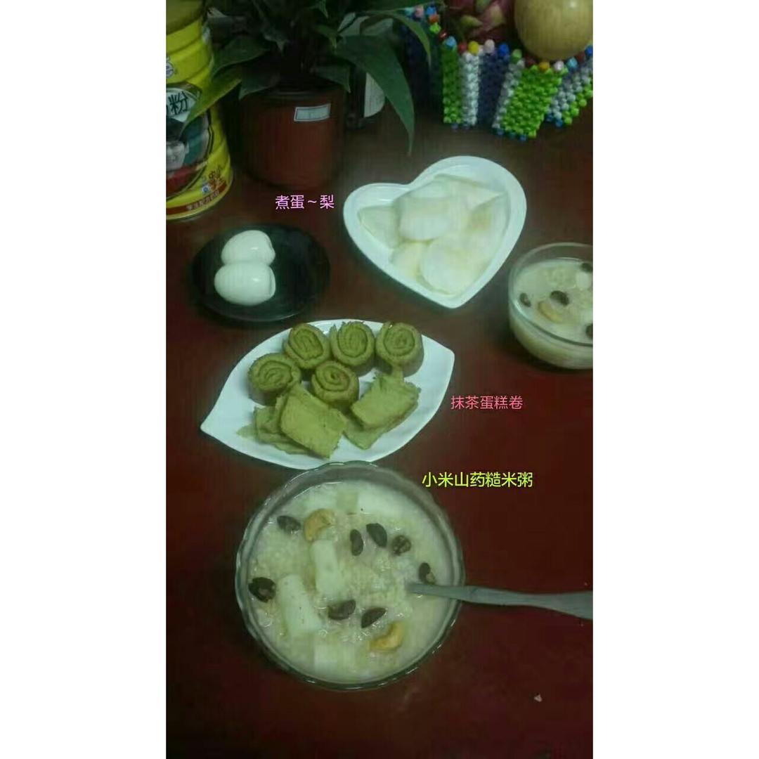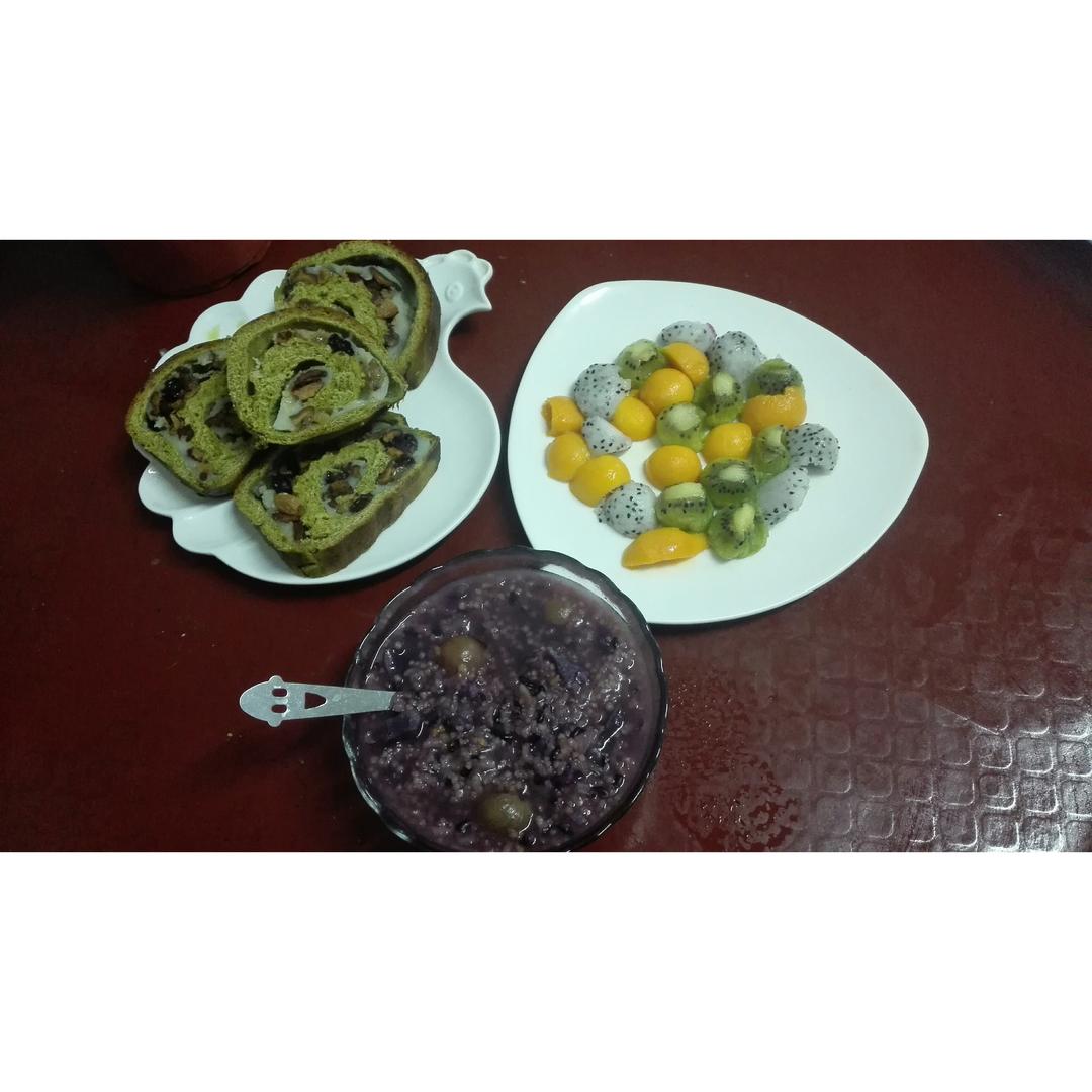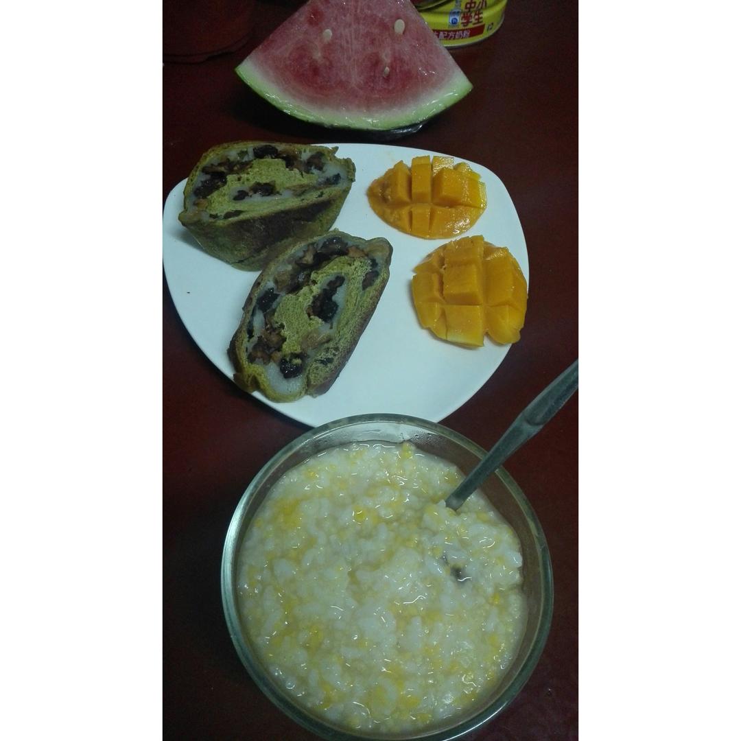 早安~紫薯小米粥~抹茶麻薯软欧~猕猴桃~芒果~火龙...