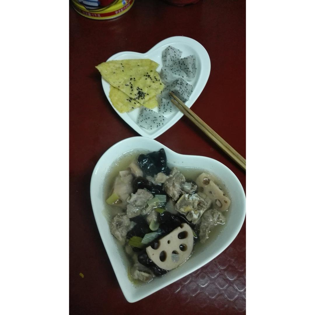 鸡蛋麦片饼~火龙果~木耳莲藕排骨汤~早上必须要吃的像皇帝...