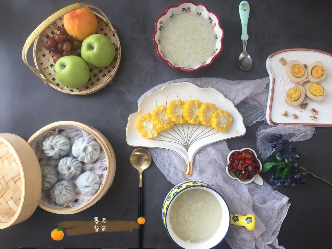 今日:猪肉葱花包、玉米、鸡蛋、小米粥、自制牛肉...