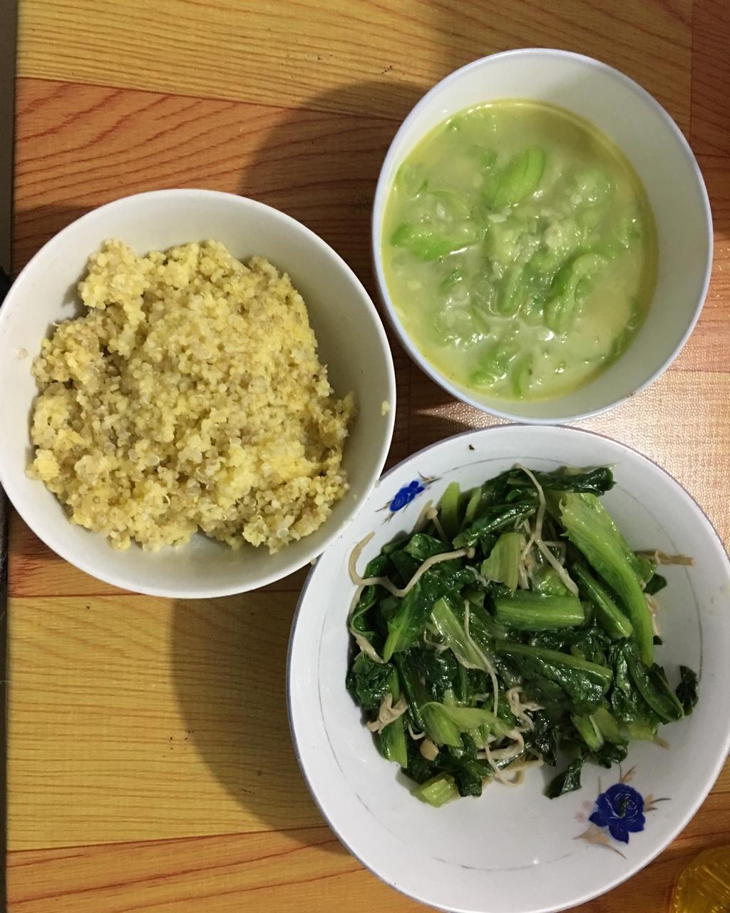 孕32周+4天,晚饭:小米藜麦干饭+茶油炒丝瓜(不放盐)+莴笋叶子炒金针菇,孕期净素菜谱,孕期素食菜谱 #晚餐•2018...