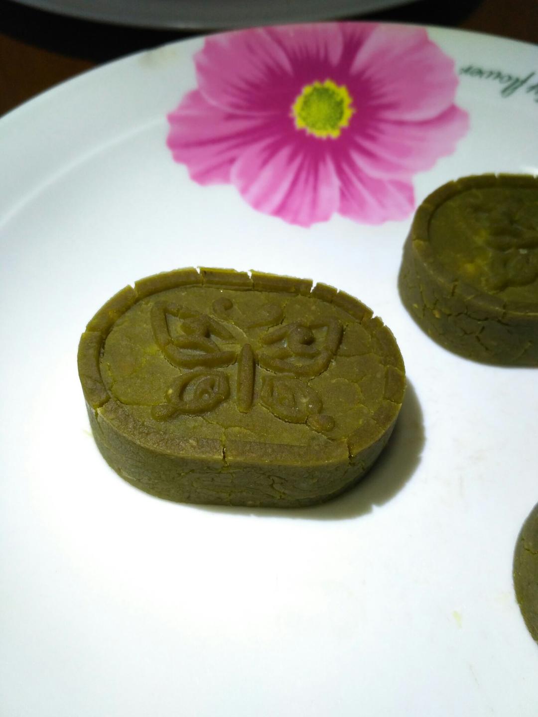 绿豆糕,加一点抹茶。放了一夜,表皮有点干裂