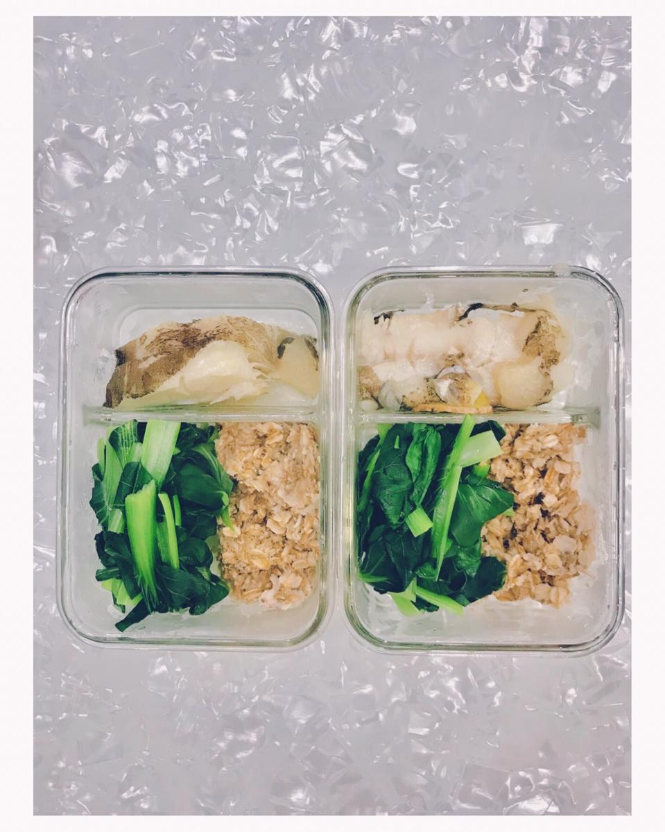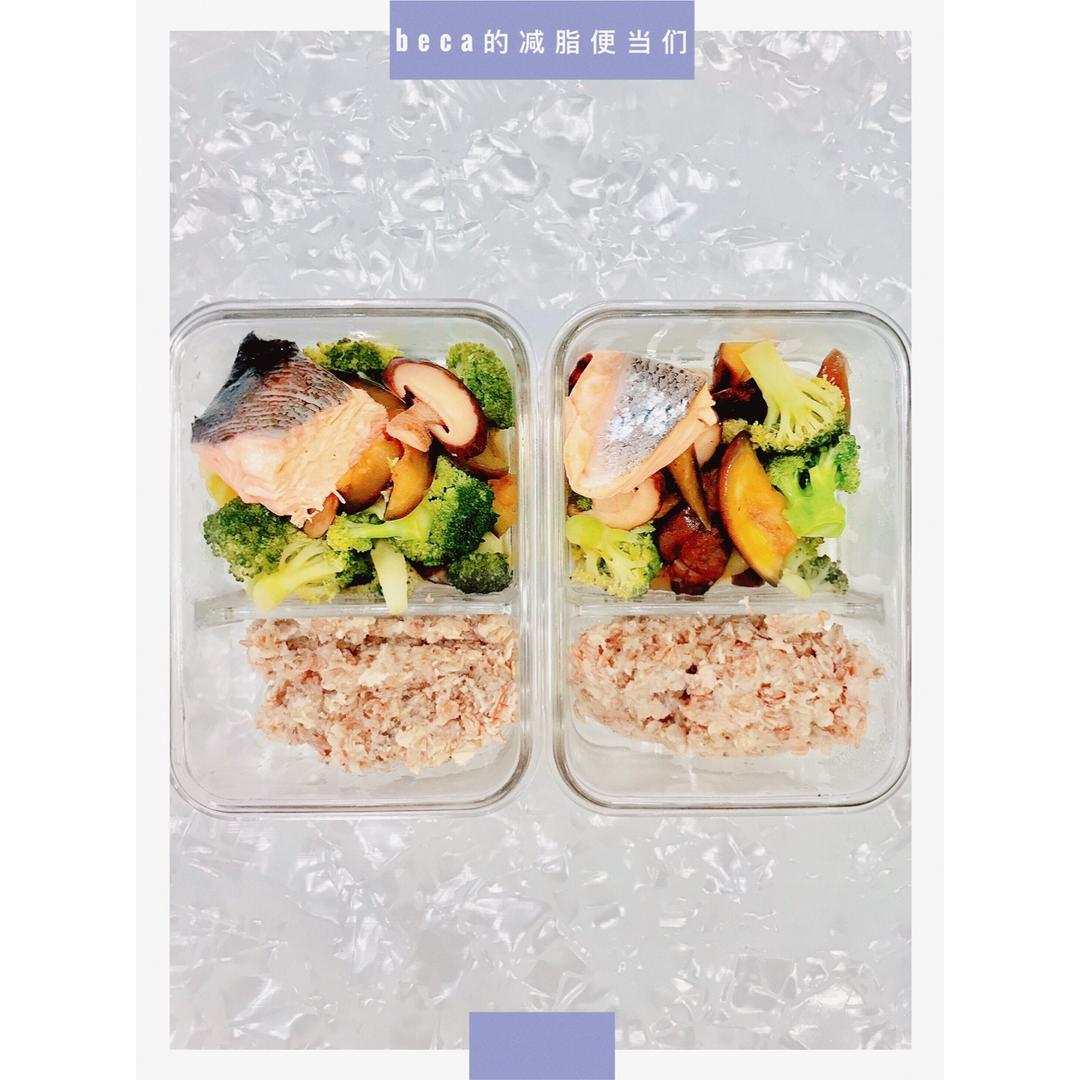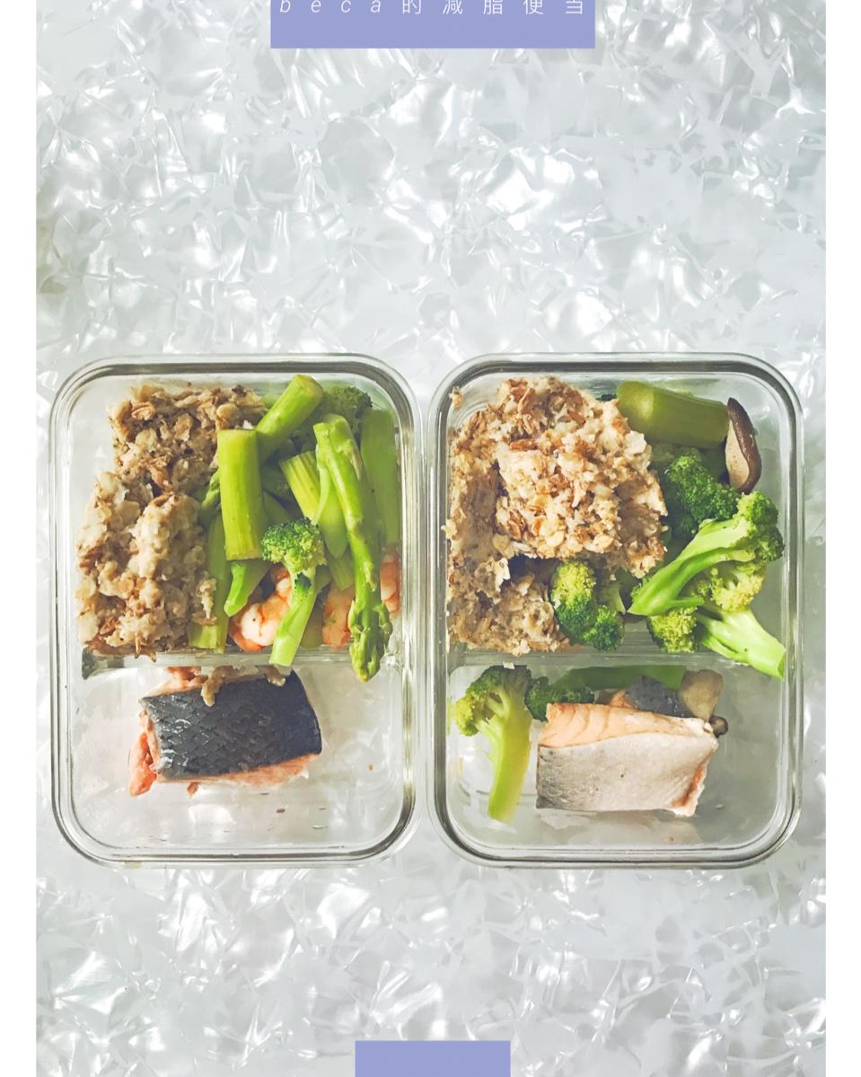 一份便当:燕麦45g三文鱼60g西兰花75g茄子75g香...