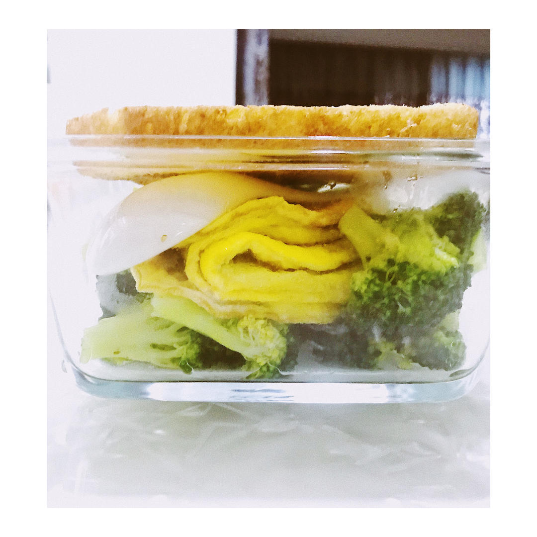 西兰花150g+秋葵50g+鸡蛋2个+全麦面包一片