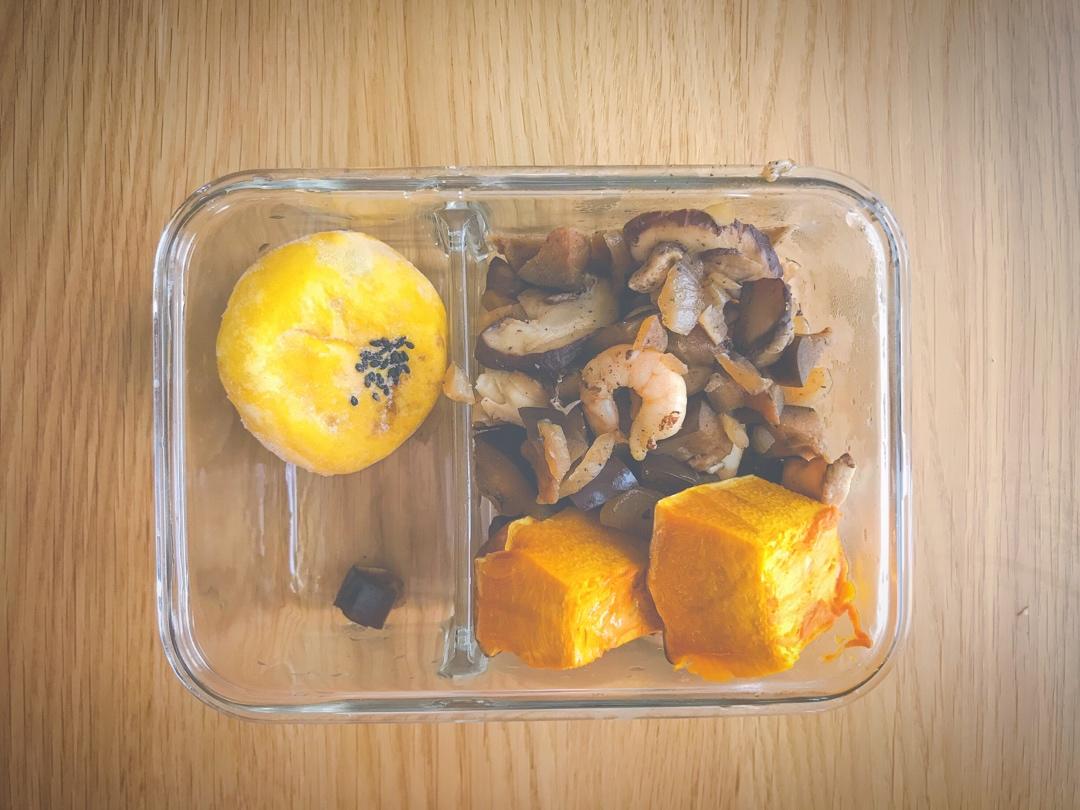 自制南瓜蔬菜面包+茄子香菇炒虾仁+烤南瓜