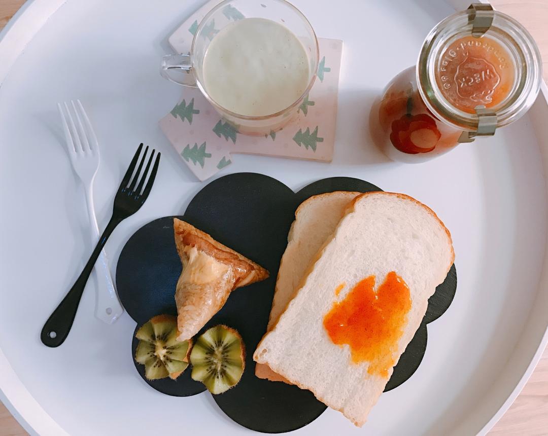 早安!继续享受悠闲的假期,昨晚婆婆包的蛋黄肉粽,杏子果酱抹吐司,这次熬杏子果酱加了一根香草荚,更美味哦,吐司是昨天的烫种...