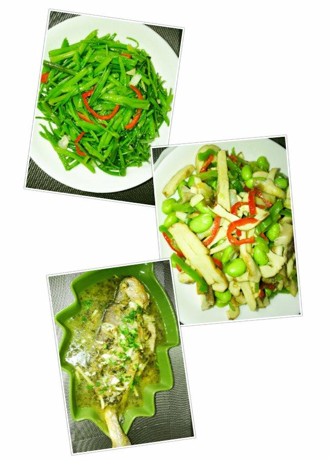 也可以说是午饭,也可以说是晚饭😜蒜泥空菜,豆干毛豆,咸菜黄鱼✌