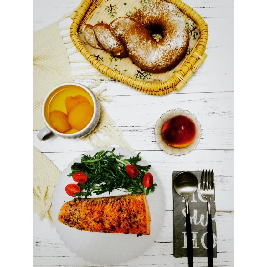 香煎三文鱼+冰糖枇杷糖水+咖啡辫子包+油桃