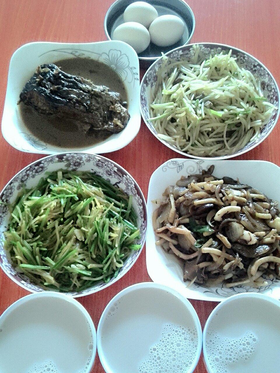 炒豆芽蒜苗+孜然鱿鱼圆葱+芹菜土豆丝