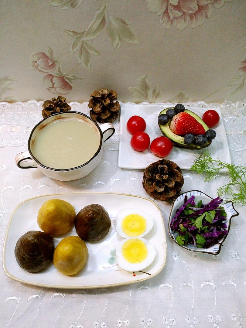绿豆米糊*玉米面/红薯面窝头*鸡蛋*拌紫甘蓝*蔬果