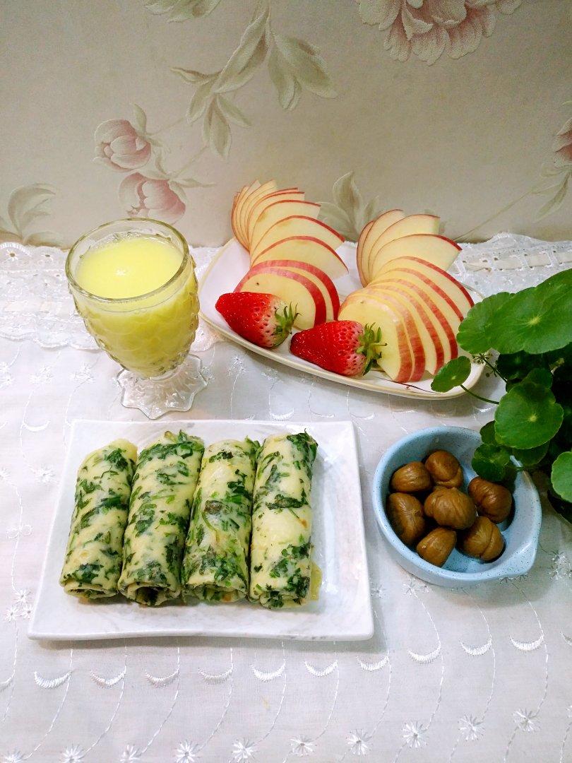 玉米汁*荠菜蛋饼*栗子*水果
