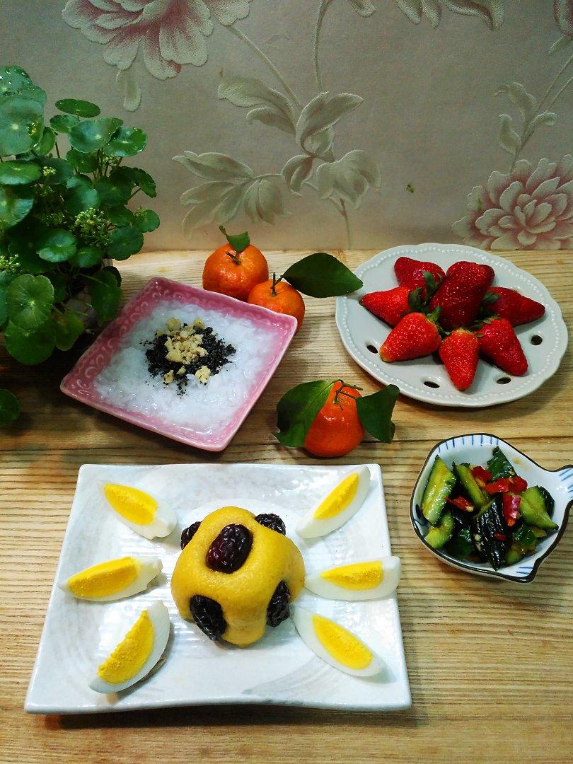 黑芝麻核桃粥*三合面枣花馍*鸡蛋*拌黄瓜*水果