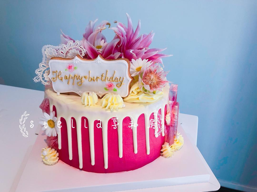 某给妞给自己白人男友麻麻定的生日蛋糕,从里到外都是桃红色系的,色素不好吃,内部全部用冻干红心火龙果粉调色哒~~~还是做了...