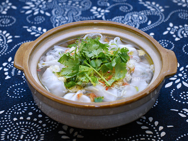 一人份的砂锅菜肉馄饨,加了适量的錦絲(即非常细的蛋丝)、樱花虾虾皮以及天かす。天かす是用天妇罗粉、蛋液、少许的盐拌匀后炸...