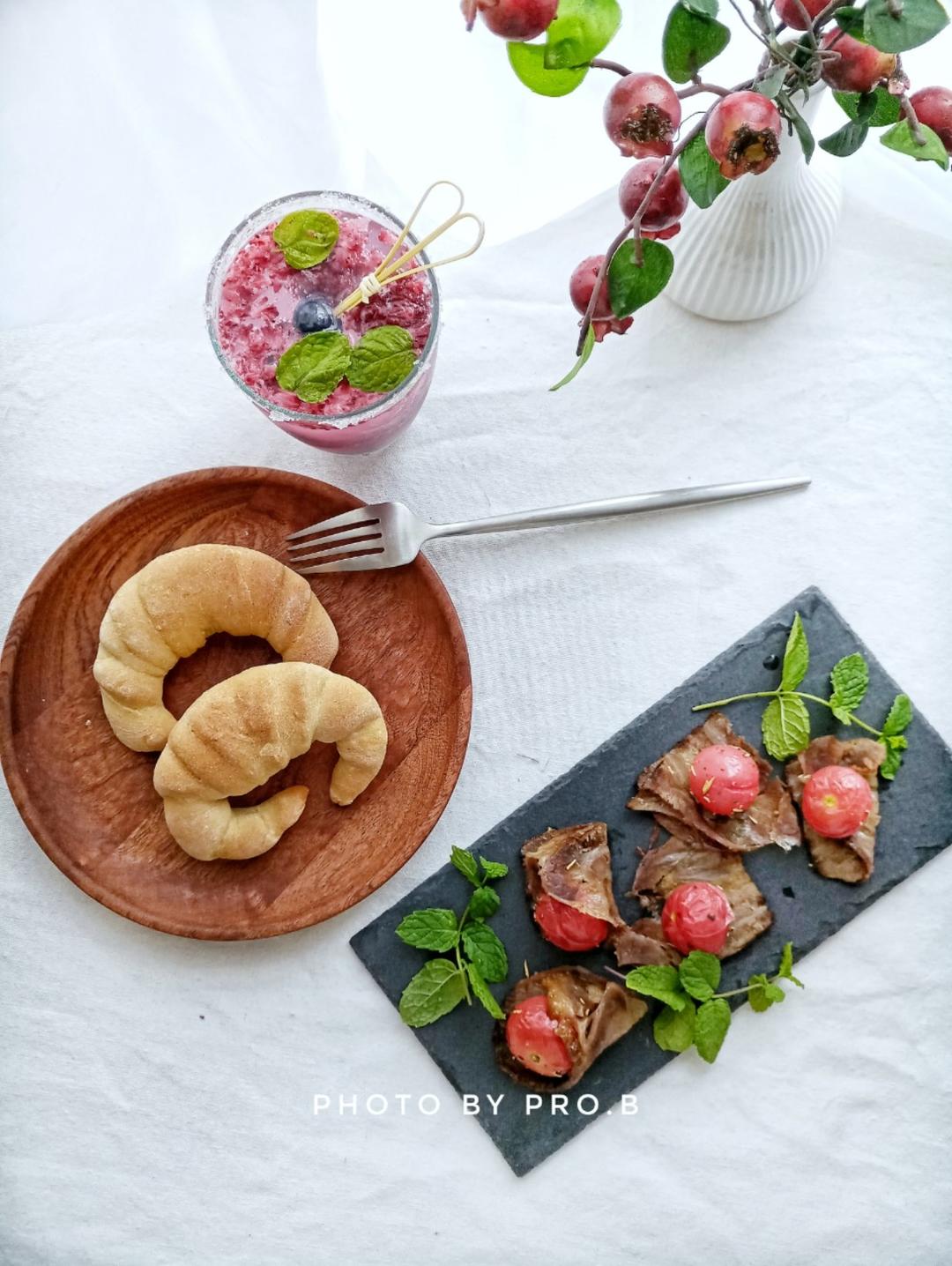 牛角包+烤番茄牛肉卷+杨梅气泡饮