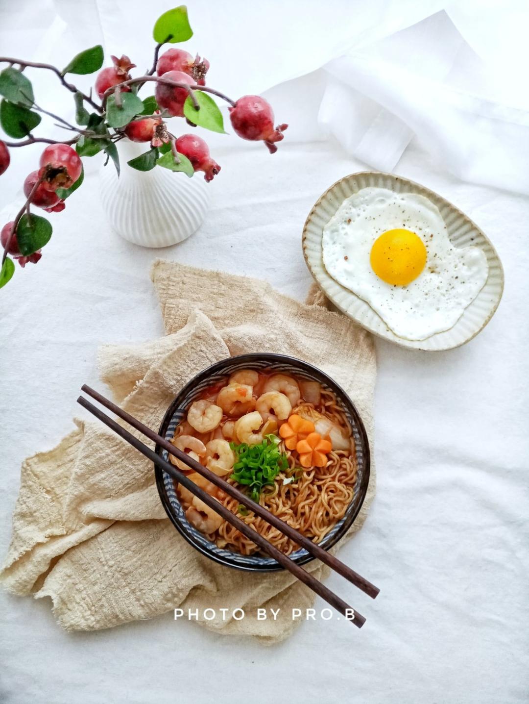 虾仁番茄热汤面+煎蛋