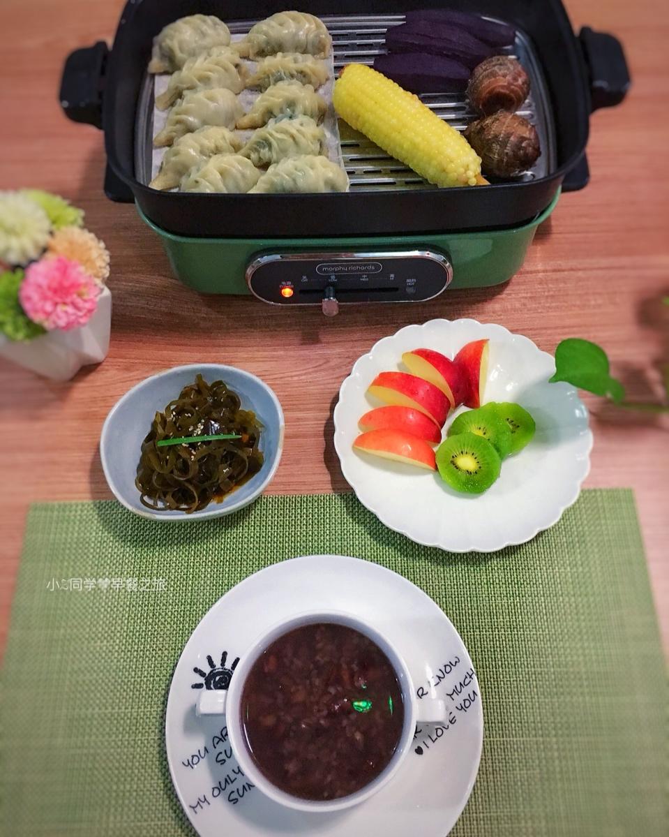 9.4早餐:红豆黑米粥+麦穗蒸饺+杂粮+拌海带+水果