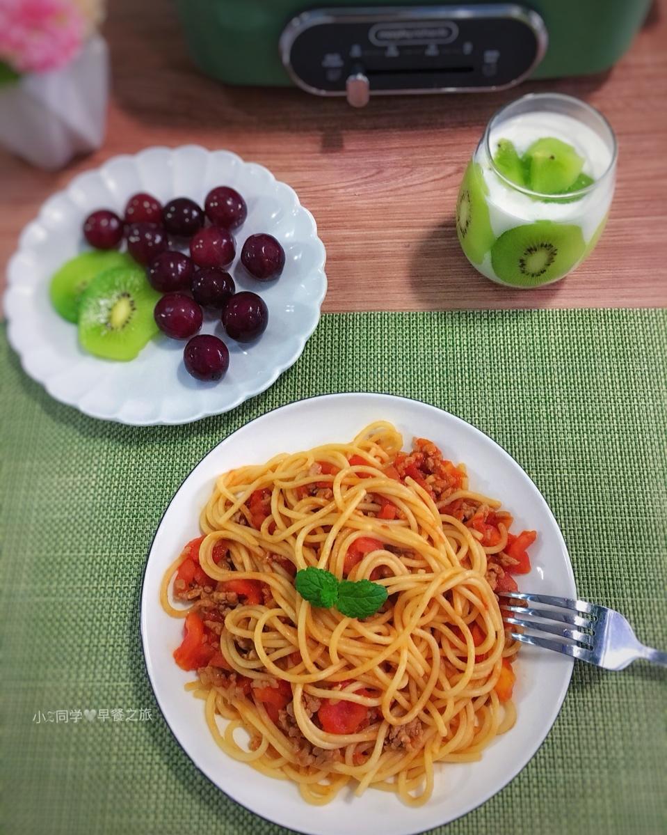 9.5早餐:番茄肉酱意面+酸奶杯+水果