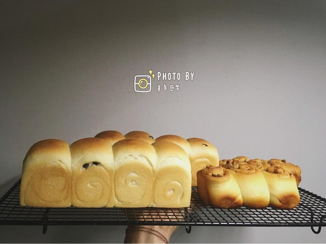 装满两个300g吐司盒之后,又匀了两个小面团出来,做了0油低糖的肉桂卷卷。