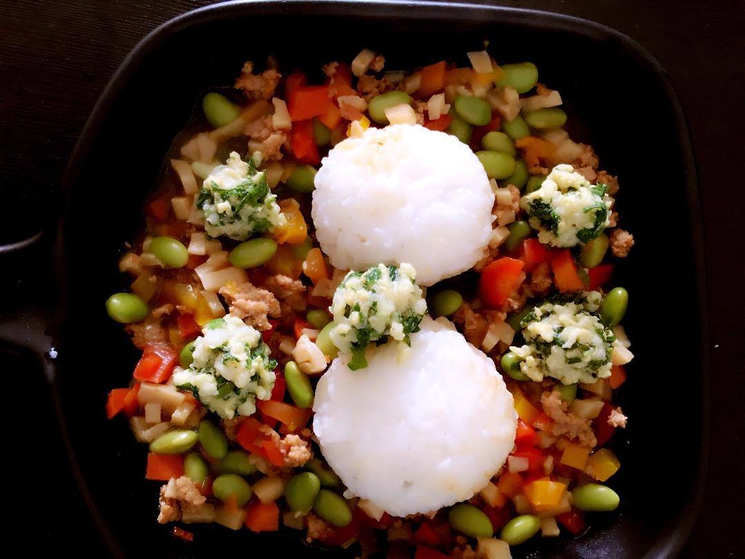 今天的午餐:五彩肉末和荠菜肉丸。 五彩肉末食材:胡萝卜,杏鲍菇,甜椒,青豆,肉末。营养丰富吧...
