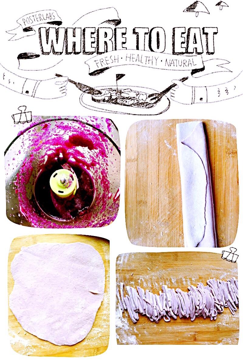 紫甘蓝面条是自己做的的,榨汁,和面,切面条,忽略刀功哈😂😂。用花蛤汤煮面配蔬...