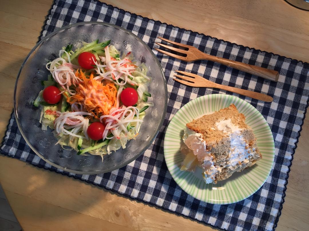 【蟹腿黄瓜拌卷心菜沙拉+桃子红茶戚风蛋糕】