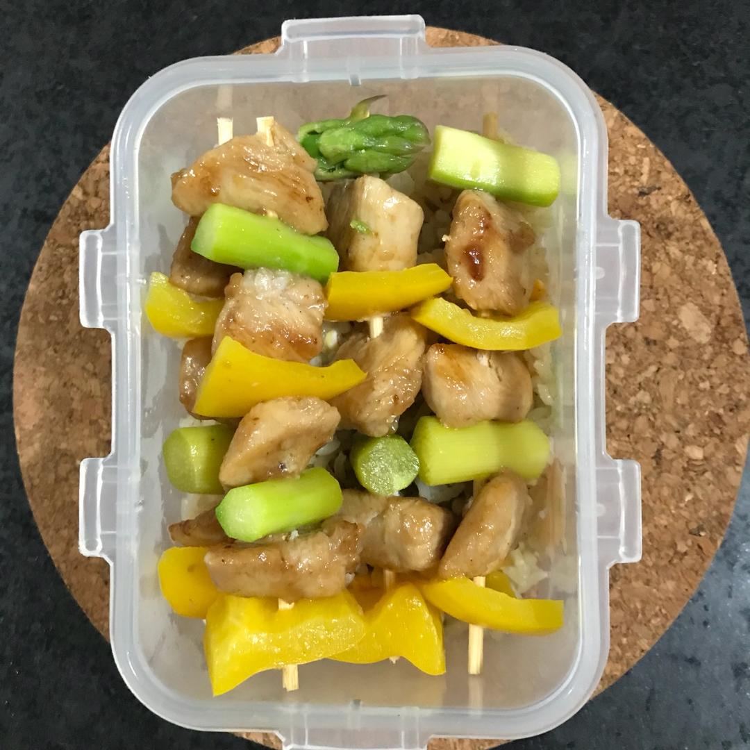 黃綠蜜糖雞肉串配蛋炒飯