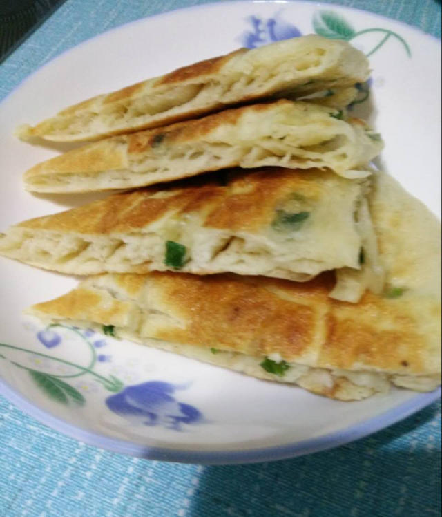 是咸味葱花饼,没弄油酥,擀开直接抹油,撒盐、五香粉、葱花做成一个大饼省事。200克面粉,冰箱发面一晚,早上操作,成品口感...